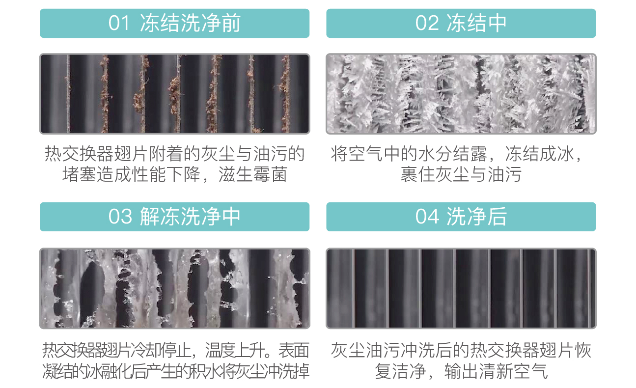急速冷卻空氣中水分,在熱交換器周圍形成凝霜并鎖住污垢灰塵,迅速溶解化水后將污垢灰塵帶走。