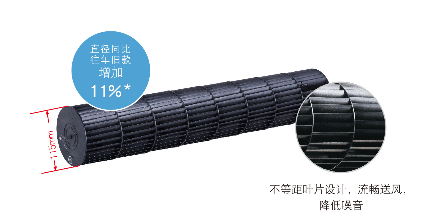 室內機采用大直徑斜流風葉,應對流體力學原理對葉片進行不等距及錯位設計,風葉運轉更流暢,風量更大,且有效降低運轉音。